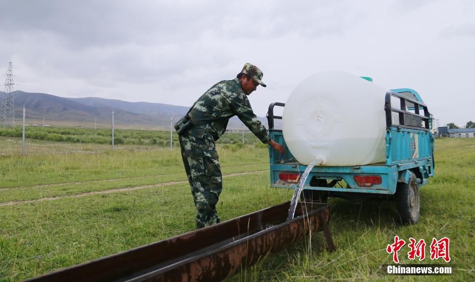 9月27日,在青海省海南藏族自治州共和縣青海湖國家級自然保護區(qū)南岸保護站內(nèi),管護員往普氏原羚的水槽內(nèi)添水。中新社記者 馬銘言 攝