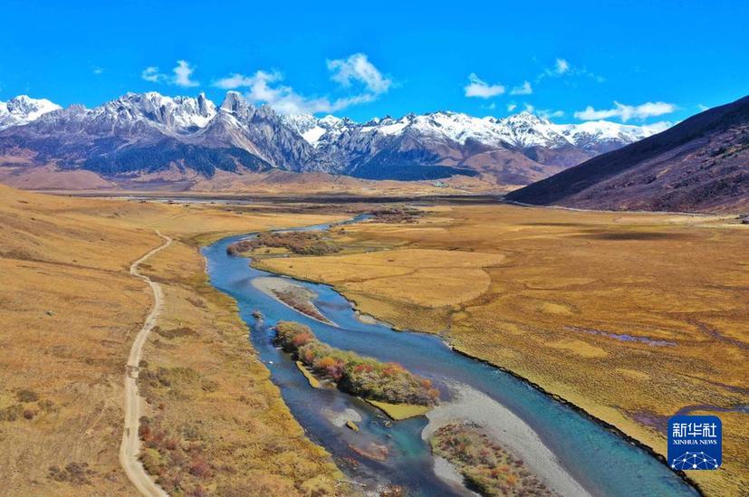 這是10月24日在措普溝景區(qū)內拍攝的章德草原(無人機照片)。新華社記者 劉坤 攝