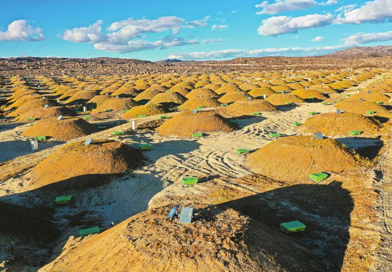 10月11日,放眼望去,觀測基地周邊均勻分布著壯觀的土堆,這就是繆子探測器。每個土堆大概有36平方米大小,土堆下是一個直徑6.8米、高1.2米的混凝土罐體,罐體中放置了裝有超純水的高反射率水袋。