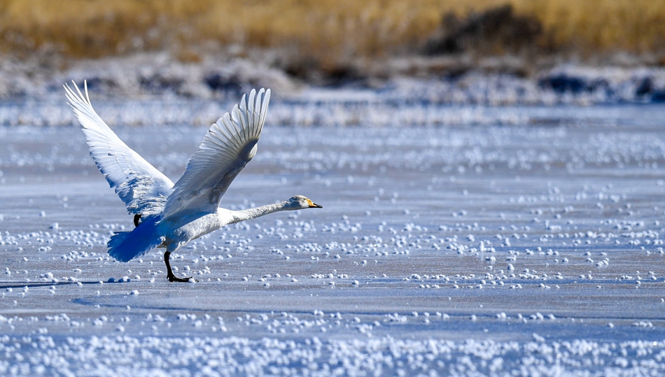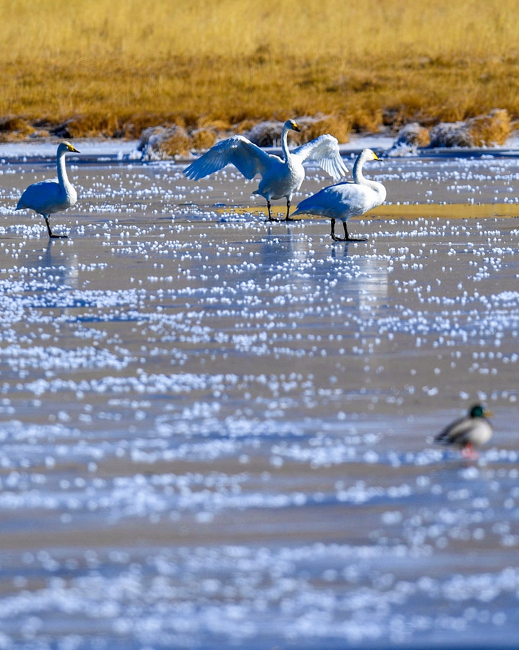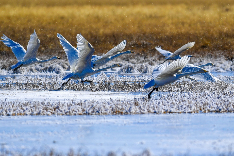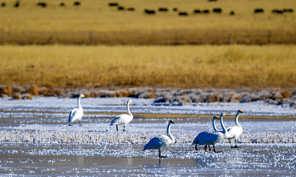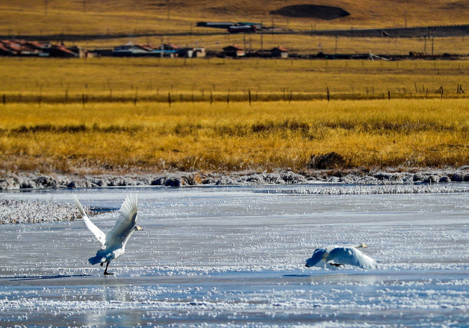入冬以來,甘肅省甘南藏族自治州碌曲縣尕海濕地越冬的大天鵝浴雪歡歌,翩翩起舞,成為草原上一道獨特的風景。
