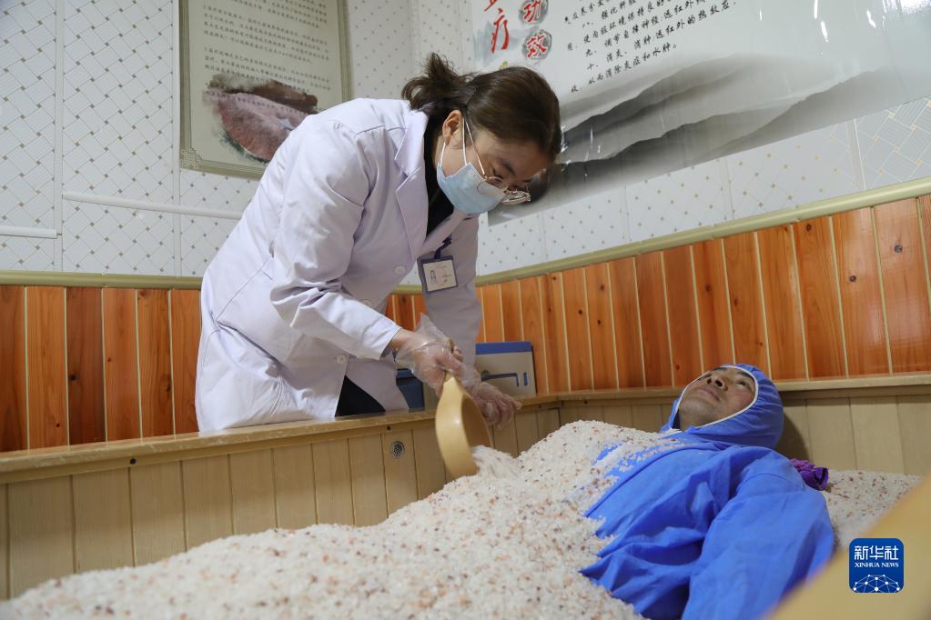 1月27日,在青海省海南藏族自治州貴德縣常牧鎮(zhèn)中心衛(wèi)生院藏醫(yī)館,護士給患者做鹽浴治療。新華社記者 央秀達珍 攝