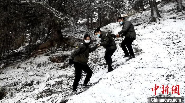 圖為巡護(hù)途中相互扶持。李雋 攝