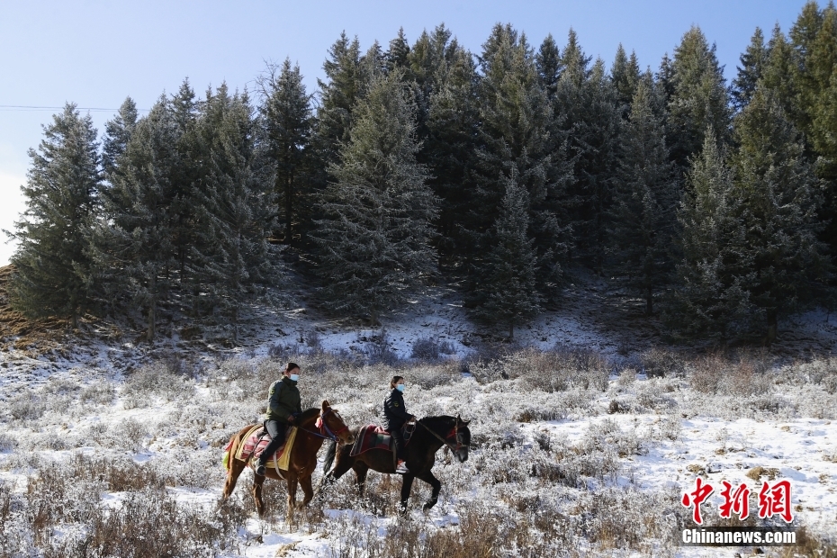 3月17日,位于祁連山腹地的青海省海北藏族自治州祁連縣,女子管護(hù)隊(duì)員們?cè)谘┑乩镅沧o(hù)。 中新社記者 馬銘言 攝