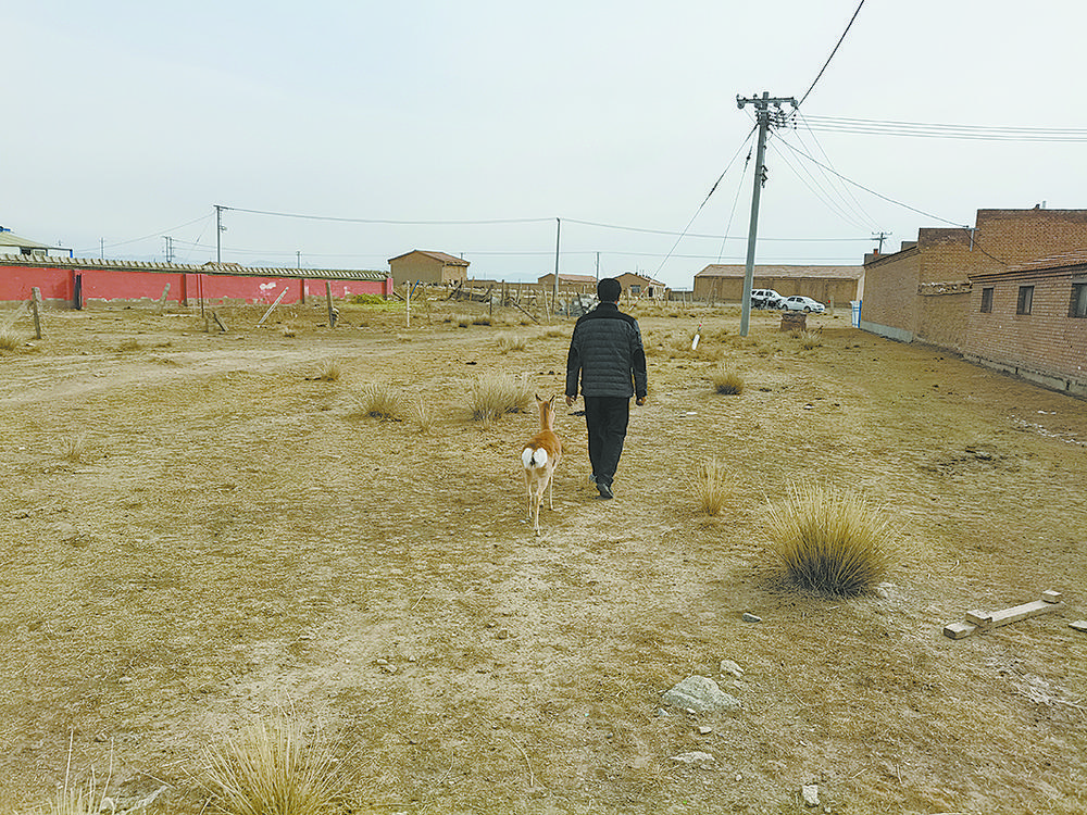 半個(gè)多月來,盡管我們已經(jīng)習(xí)慣了目睹一只普氏原羚與牧人形影不離的場景,但每當(dāng)凝望那片草色枯黃的原野,牧人周增本無論走向何處,一只小原羚總是在6、7米外不緊不慢地跟隨著他,心里便會涌起一種無以名狀的感動,不禁令人熱淚盈眶。