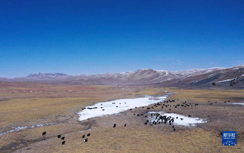 4月20日,在青海省玉樹藏族自治州曲麻萊縣,牦牛在草原上覓食(無(wú)人機(jī)照片)。新華社記者 柳澤興 攝