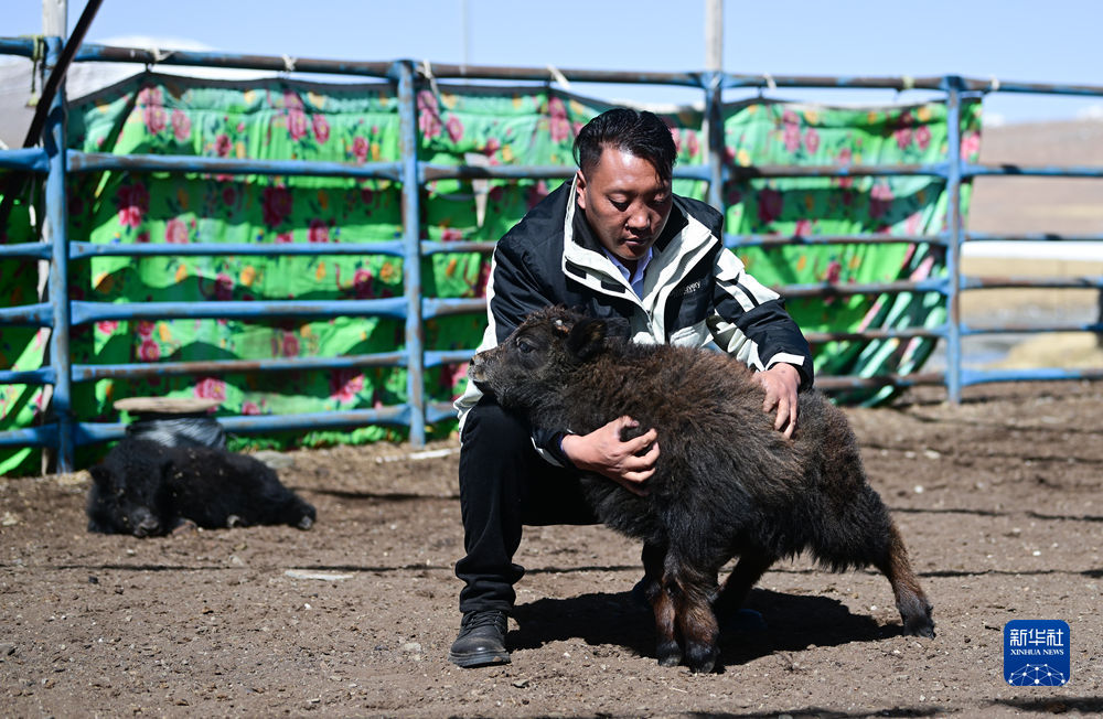 4月20日,在青海省玉樹藏族自治州曲麻萊縣,牧民在查看牛犢生長(zhǎng)情況。新華社記者 張龍 攝