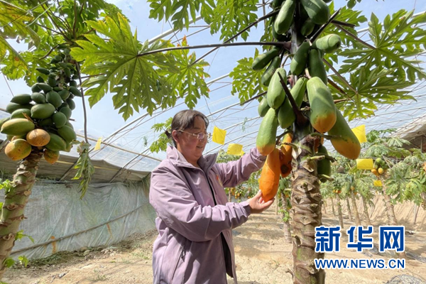 (資料圖)農(nóng)戶查看特色種植水果的長勢。新華網(wǎng)發(fā)