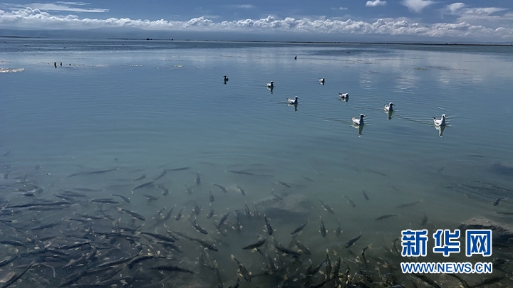 魚(yú)鳥(niǎo)共生的青海湖。新華社記者 李琳海 攝