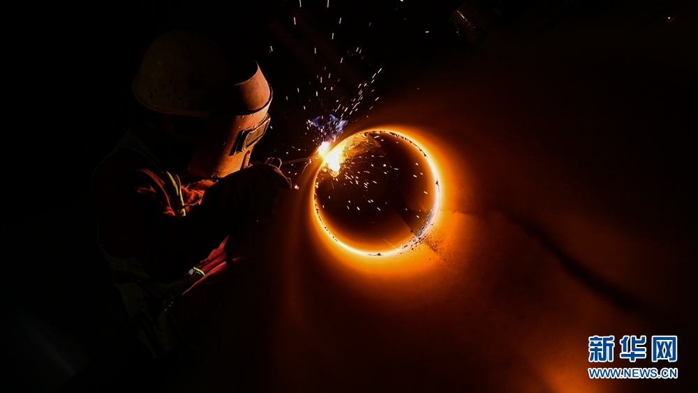 工人在地下廠房施工現(xiàn)場焊接管道。