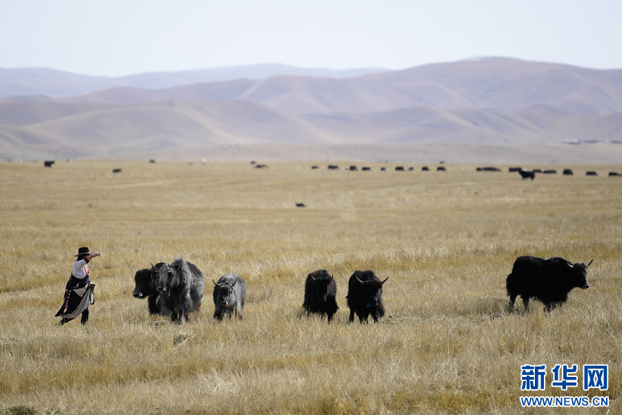秋日時(shí)節(jié),在黃南州澤庫(kù)縣寧秀鄉(xiāng),當(dāng)?shù)啬撩裨诓菰戏拍?。新華社記者 張龍 攝