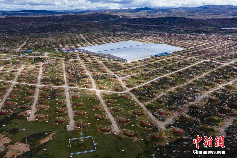 6月28日,四川稻城,稻城高海拔宇宙線觀測站均勻分布的探測器。海拔4410米的四川省甘孜州稻城縣海子山,5216個電磁粒子探測器和1188個繆子探測器,以及占地78000平方米的水切倫科夫探測器有序分布在1.36平方公里范圍,十分壯觀,這是中國建設的第三代高山宇宙線實驗站。 中新社記者 劉忠俊 攝