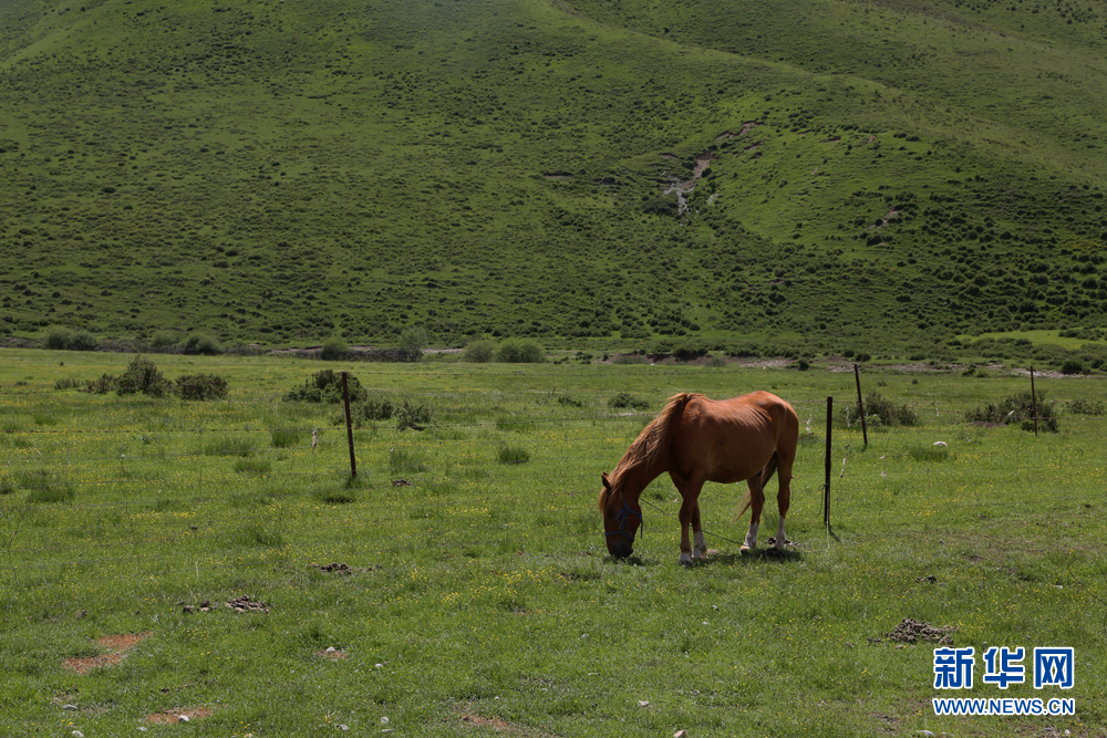 青海洮河源國家濕地公園內(nèi),一匹馬兒正在愜意地吃草。新華網(wǎng) 卡婭梅朵 攝