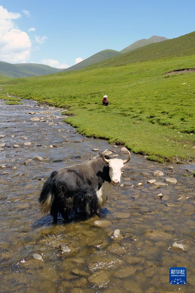 在稱多縣歇武鎮(zhèn)牧業(yè)村,牦牛在河邊飲水(7月4日攝)。新華社記者 范培珅 攝