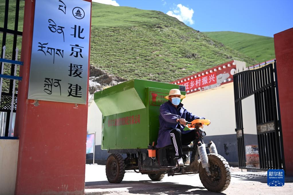 在稱多縣歇武鎮(zhèn)牧業(yè)村的牦牛養(yǎng)殖基地,工作人員駕駛自動(dòng)撒料車駛向牛舍(7月4日攝)。新華社記者 范培珅 攝