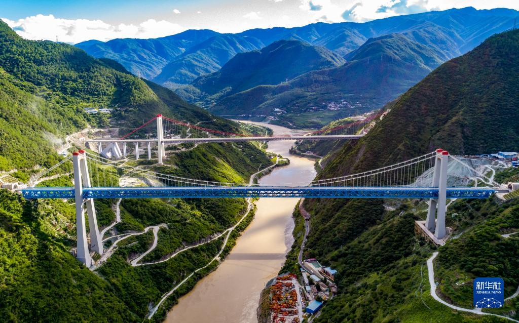 7月27日拍攝的麗香鐵路金沙江特大橋(無(wú)人機(jī)照片)。大橋左邊連接哈巴雪山隧道,右邊連接玉龍雪山隧道。新華社記者 陳欣波 攝