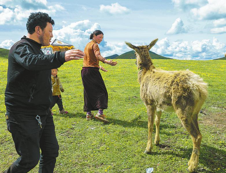 這只“賴”上達瓦拉姆一家的白唇鹿,是2021年5月達瓦拉姆在牧場里發(fā)現(xiàn)的。當時落單的它只有幾個月大小,身體極度虛弱,達瓦拉姆將它抱回家中用牦牛奶喂養(yǎng)。經(jīng)過他們一家照護和喂養(yǎng),小白唇鹿長成了如今的大個子,變得活蹦亂跳,每天都會跟著達瓦拉姆家的牦牛群在高原牧場吃草玩耍,而后再一路跑回來。