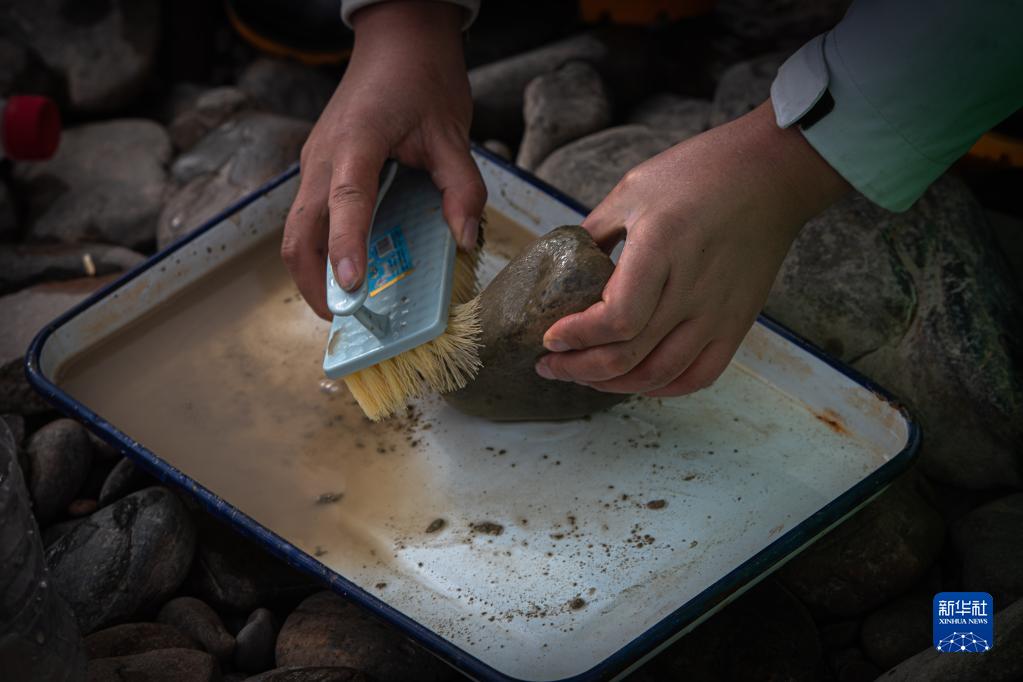 7月25日,長江科學院科考隊員在采集底棲動物樣本。 新華社記者 肖藝九 攝