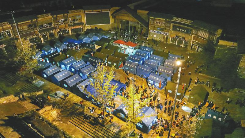 9月5日晚,瀘定縣磨西鎮(zhèn)貢嘎廣場(chǎng)的臨時(shí)安置點(diǎn)燈火通明。 四川日?qǐng)?bào)全媒體記者 吳聃 攝