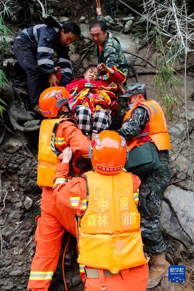 9月6日,救援人員攀爬高山,向?yàn)o定縣得妥鎮(zhèn)灣東村挺進(jìn)。新華社記者 沈伯韓 攝