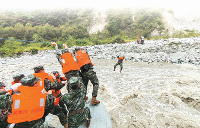 在震中瀘定縣磨西鎮(zhèn)磨子溝村,有部分傷員和群眾被滾滾急流困住。面對(duì)險(xiǎn)情,參與救援的一線(xiàn)特警隊(duì)員毫不猶豫,用身體和繩索搭起“生命通道”,迅速轉(zhuǎn)移被困群眾。[詳細(xì)] -