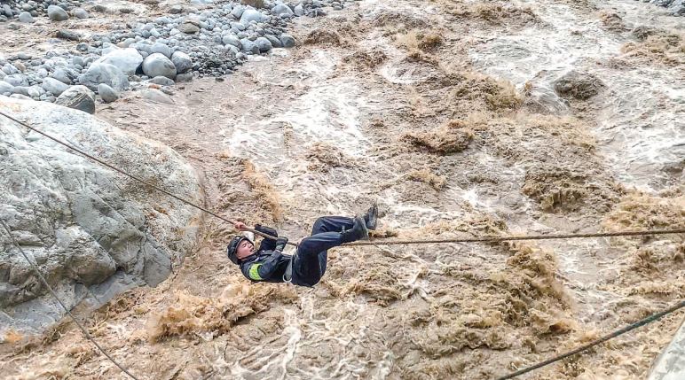 9月6日下午,鄺文學(xué)接到通知,前往瀘定燕子溝沿線搜救傷員。在一處河灘旁看到兩岸聚集了不少群眾,消防官兵也已經(jīng)搬運(yùn)來鋼管、腳手架等,但便橋的選址、架橋的方式等問題,大家一直在討論。鄺文學(xué)立刻上前,怎么使用這些材料、怎么搭建更穩(wěn)一點(diǎn)、哪里選址相對安全……鄺文學(xué)很快有了答案?!昂恿鞑凰闾貏e寬,大約12米到15米,但我覺得卻是壓力最大的一次?!编椢膶W(xué)和隊(duì)員們把“壓箱底”的功夫都拿了出來。3個多小時,一座鋼架便橋橫跨燕子溝兩岸。