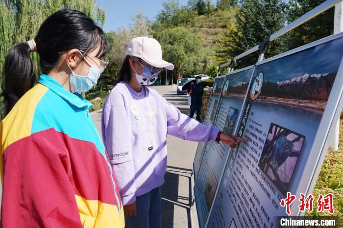 圖為青海野生動物救護(hù)繁育中心副主任通過展板向?qū)W生介紹兔猻。馬銘言 攝