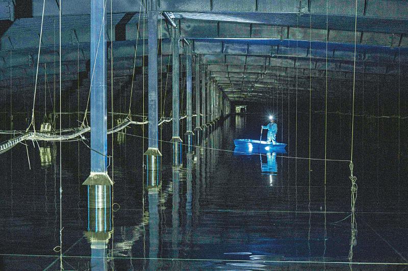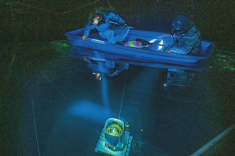 24日,陳明君和同事穿上潔凈服、戴上腳套,劃著小船進(jìn)入伸手不見(jiàn)五指的三號(hào)水池,他們要逐一檢查維護(hù)這里的探測(cè)器單元和電子學(xué)箱。船劃到指定位置,黑暗中陳明君的頭燈光束直射水底,水下碩大的探測(cè)器單元核心設(shè)備——光電倍增管,被照得清晰可見(jiàn),他和同事一起用“鉤子”把光電倍增管拉起,進(jìn)行檢查?!八乩锏纳疃仁?.5米,這些純凈水的透明度比自來(lái)水高三倍以上,切倫科夫光就從里面捕獲?!标惷骶嬖V記者。