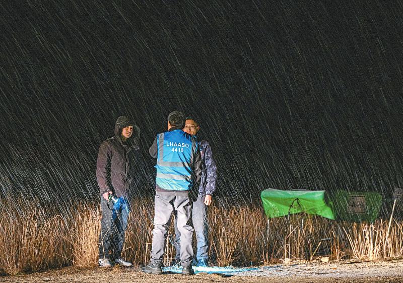 換好服裝走出3號(hào)水池的陳明君與團(tuán)隊(duì)工作人員來(lái)到屋外,他們討論著今天檢測(cè)遇到的問(wèn)題。飛舞的雪花在車燈的照射下,在空中拉起了根根亮線,陳明君說(shuō):“它們看起來(lái)真美,就像宇宙線來(lái)到拉索的軌跡。我們將時(shí)刻準(zhǔn)備好,迎接更多、更遠(yuǎn)的‘宇宙信使’。”