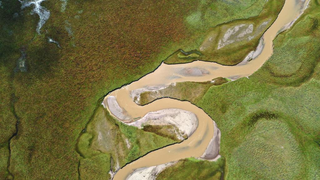 游客在甘肅省甘南藏族自治州瑪曲縣河曲馬場的濕地游覽(2019年6月22日攝,無人機照片)。新華社記者 陳斌 攝