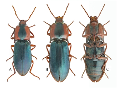 2022年6月17日,綿陽師范學(xué)院團(tuán)隊(duì)來到四川省阿壩藏族羌族自治州黑水縣,開展草原有害生物普查工作。當(dāng)天下午6點(diǎn)過,他們到達(dá)了黑水縣,在蘆花鎮(zhèn)四美村的一條土路旁,一只長(zhǎng)相新奇的甲蟲引起了許浩的注意?!八l(fā)現(xiàn)后趕緊叫住我,甲蟲呈現(xiàn)金屬藍(lán)色光澤,在其前胸背板的兩側(cè),都有紅色斑紋,長(zhǎng)得特別好看?!鼻聱樥f,“當(dāng)時(shí)初步判斷是一個(gè)金叩甲的物種,但以前從來沒見過?!?/p>