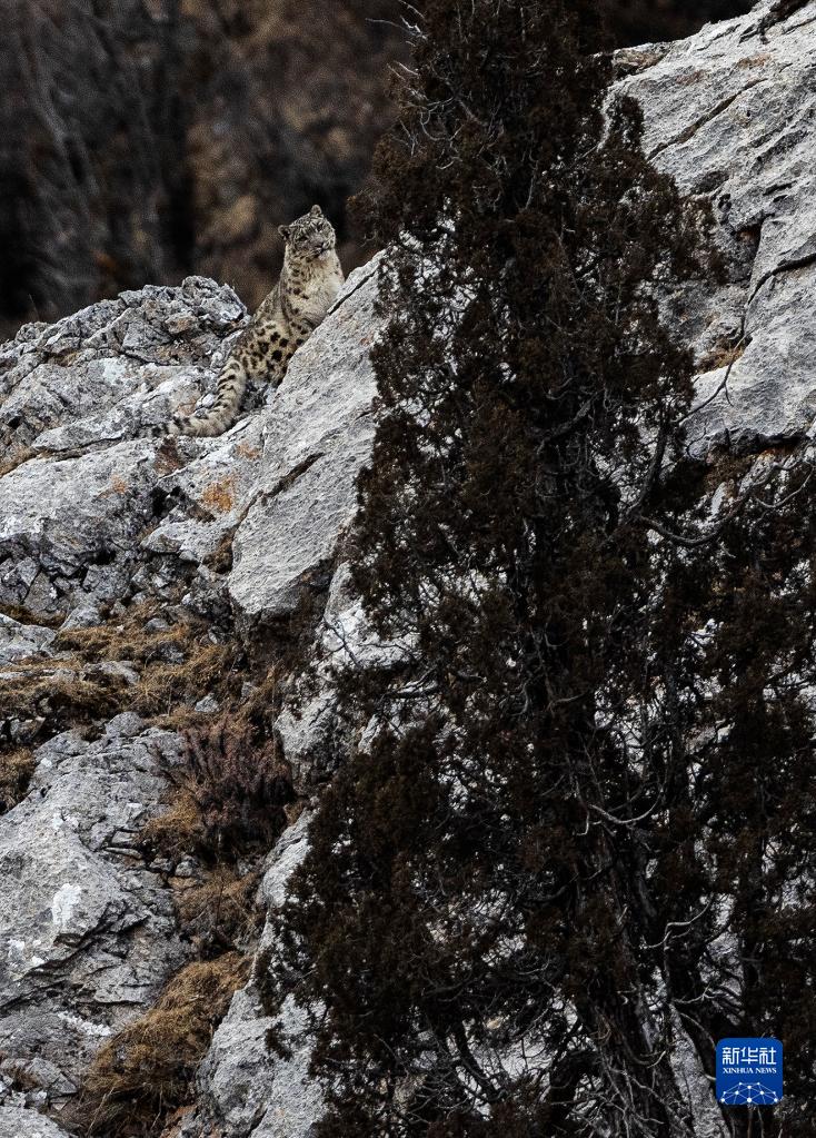 2月21日,在青海省玉樹(shù)藏族自治州雜多縣昂賽鄉(xiāng)境內(nèi)的昂賽大峽谷內(nèi),一只雪豹準(zhǔn)備向上攀爬。新華社記者 費(fèi)茂華 攝