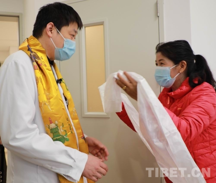 圖為來自青海省果洛藏族自治州的唇腭裂患兒家屬為中國(guó)醫(yī)學(xué)科學(xué)院整形外科醫(yī)院唇腭裂整形科主任宋濤獻(xiàn)上哈達(dá) 攝影:劉莉