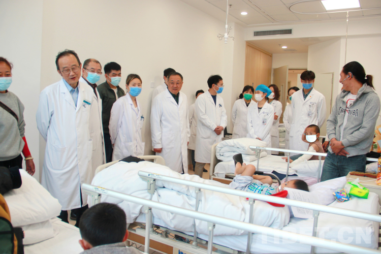 圖為中國(guó)醫(yī)學(xué)科學(xué)院整形外科醫(yī)院院長(zhǎng)蔣海越教授(左六),院黨委書記王寶璽教授(左二)等院領(lǐng)導(dǎo)班子成員來(lái)到病房看望來(lái)自青海果洛的患兒及患兒家屬攝影:劉莉