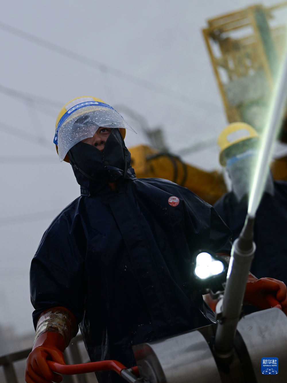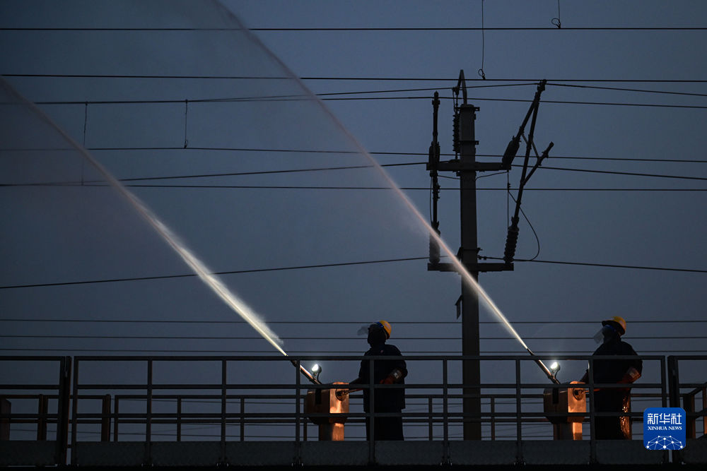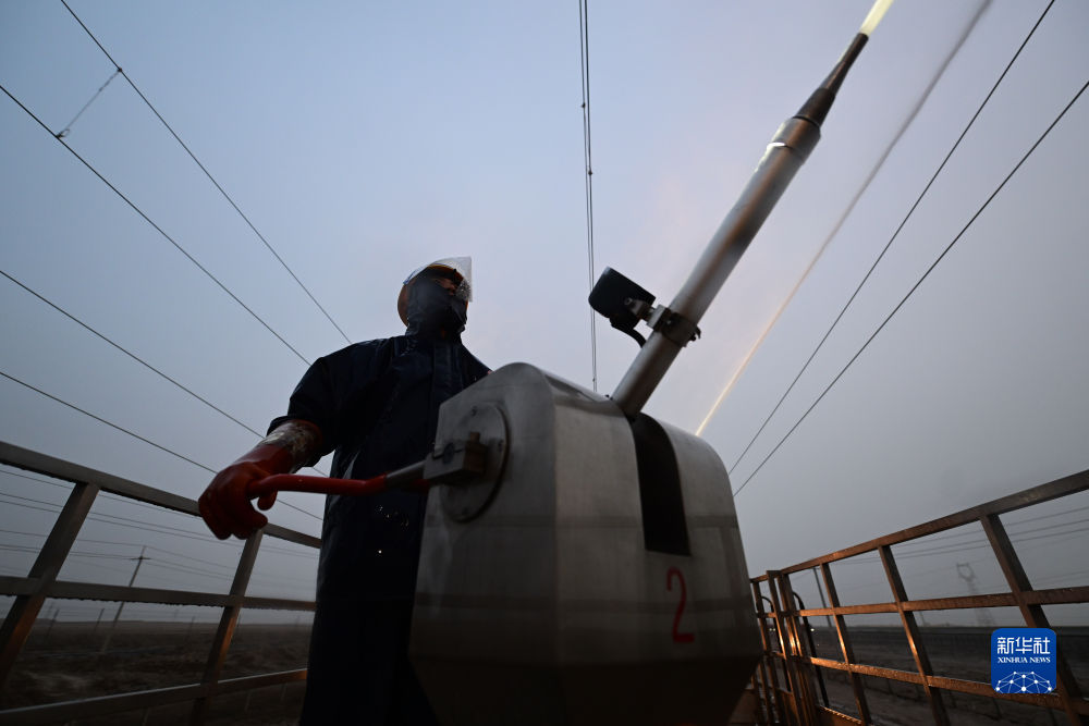 4月20日,中國鐵路青藏集團有限公司西寧供電段格爾木大修車間大修網(wǎng)工區(qū)檢修工使用高壓沖洗水槍對絕緣子設(shè)備進行清洗。新華社記者 張龍 攝