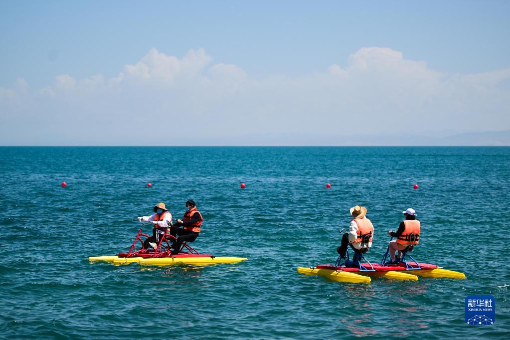 5月18日,在青海湖二郎劍景區(qū),游客在體驗水上游樂項目。新華社記者 張龍 攝