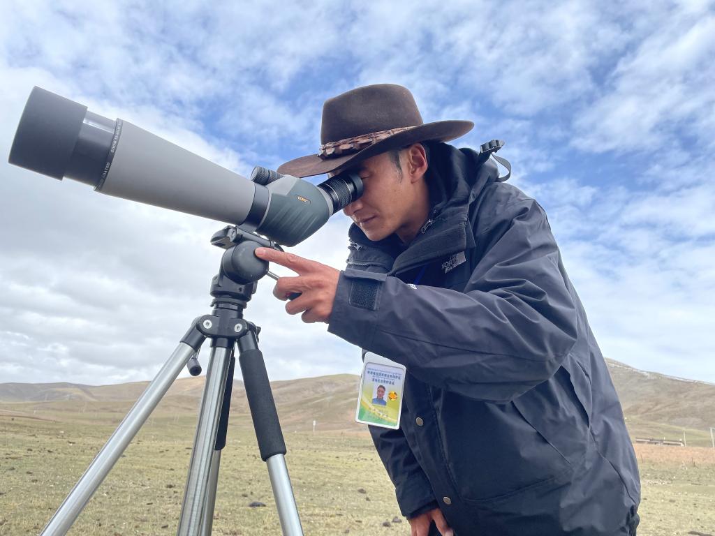 5月21日,昂旺才仁正在用望遠(yuǎn)鏡觀察鳥(niǎo)類(lèi)活動(dòng)。 新華社記者 李琳海 攝