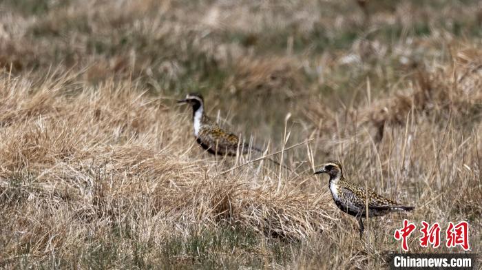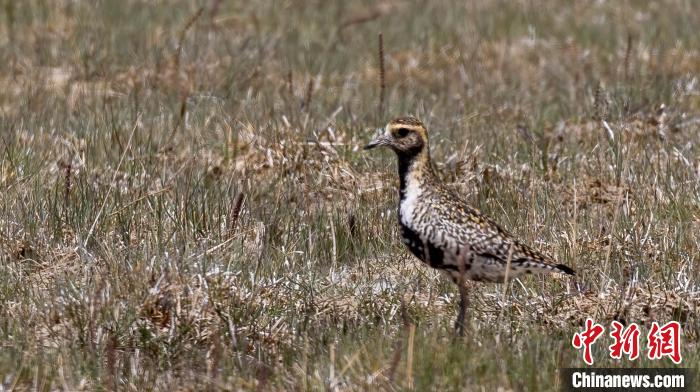 圖為金斑鸻在草叢覓食。克魯克湖托素湖自然保護(hù)區(qū) 攝