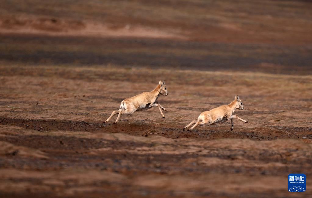 兩只藏羚羊在可可西里卓乃湖區(qū)域活動(dòng)(6月17日攝)。新華社記者 張宏祥 攝