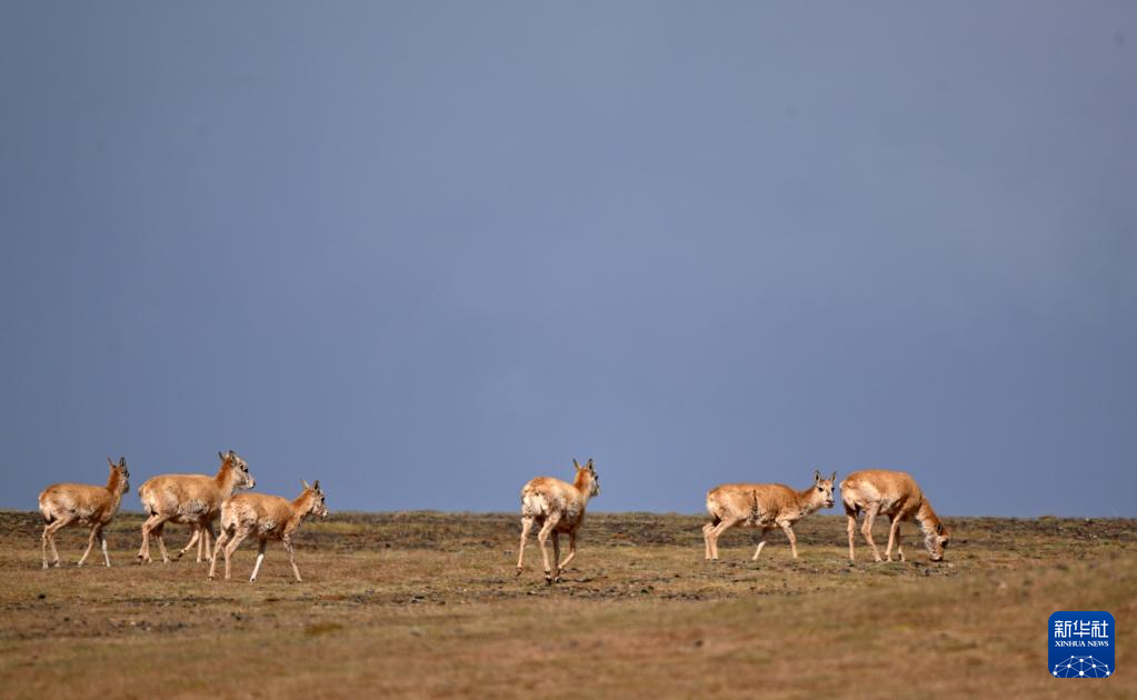 一群藏羚羊在可可西里卓乃湖區(qū)域活動(dòng)(6月17日攝)。新華社記者 張宏祥 攝