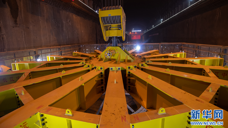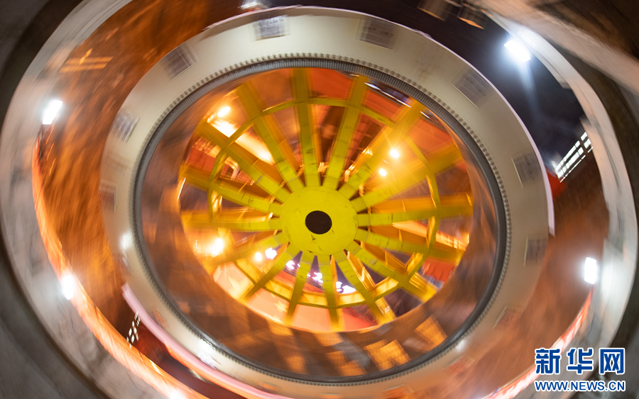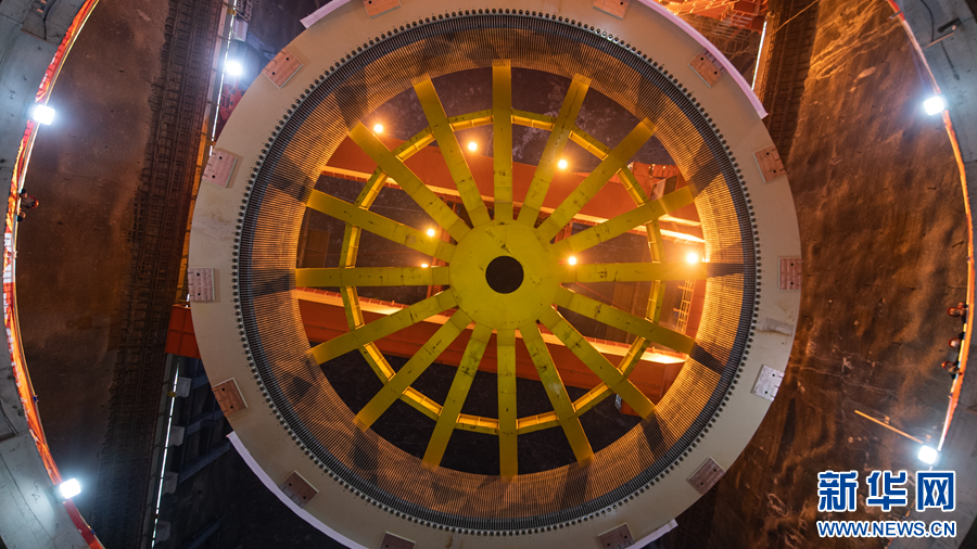 6月30日,瑪爾擋水電站地下廠房?jī)?nèi),工作人員正在進(jìn)行首臺(tái)機(jī)組定子吊裝作業(yè)。新華網(wǎng) 潘彬彬 攝