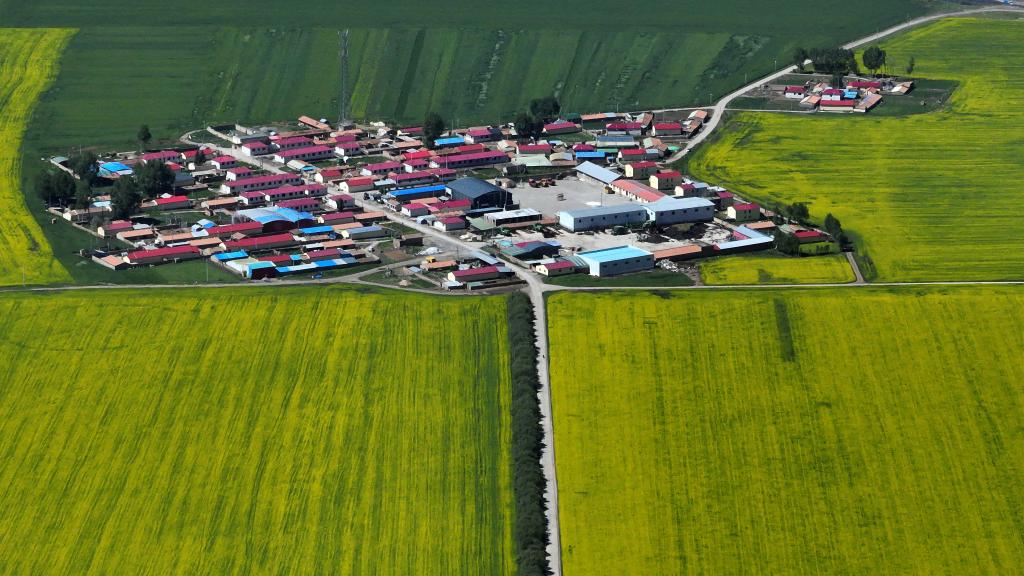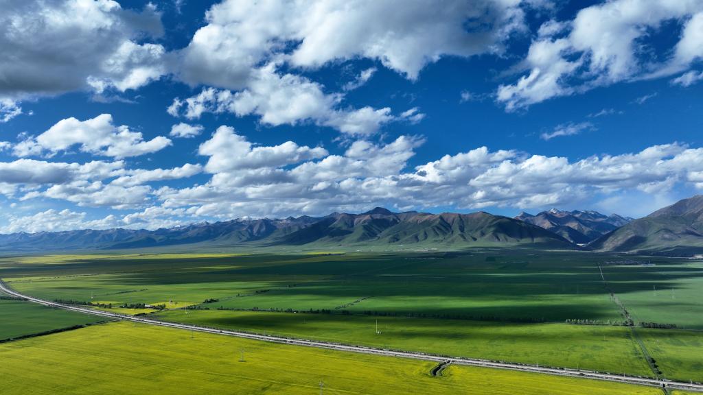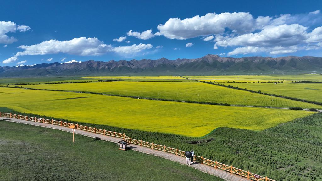 夏日,在位于祁連山腹地的青海省海北藏族自治州門源回族自治縣境內(nèi),油菜花競相綻放,花海、雪山、草原共同組成色彩斑斕的祁連山夏日畫卷。