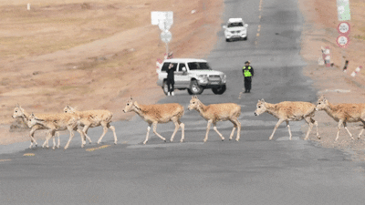 而在青藏公路這頭,可可西里管理處安排工作人員采取短暫交通管制、禁止鳴笛、巡護(hù)救助等措施,為藏羚羊遷徙產(chǎn)仔保駕護(hù)航。伴隨遷徙高峰期的到來,藏羚羊“過公路”已經(jīng)成為青藏公路沿線的一道獨(dú)特風(fēng)景。