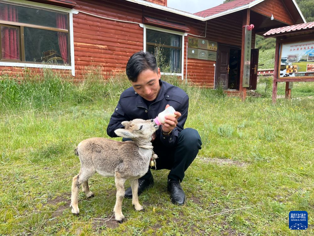 7月26日,旦增拉巴正在給救助的羊羔喂奶。新華社記者李彥南 攝