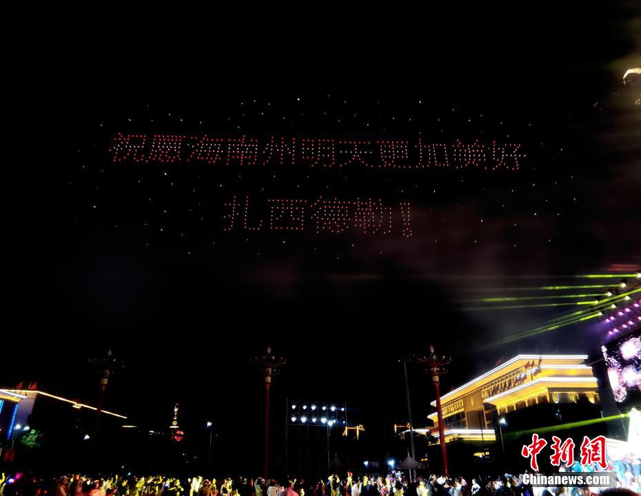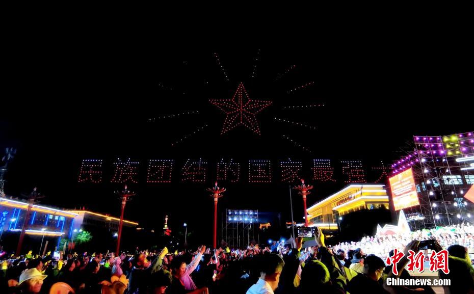 圖為無(wú)人機(jī)秀現(xiàn)場(chǎng),無(wú)人機(jī)組成“民族團(tuán)結(jié)的國(guó)家最團(tuán)結(jié)”字樣。祁增蓓 攝