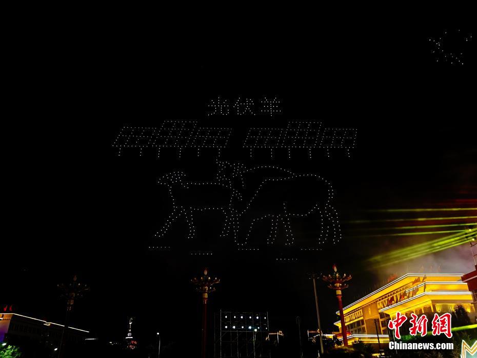 7月31日晚,青海省海南藏族自治州,800余架無(wú)人機(jī)騰空而起,以夜空為畫(huà)布,以燈光為畫(huà)筆,組成“光伏羊”“揚(yáng)帆起航”“防沙治沙”“扎西德勒(藏語(yǔ),意為吉祥如意)”等字樣,慶祝青海省海南藏族自治州成立70周年。