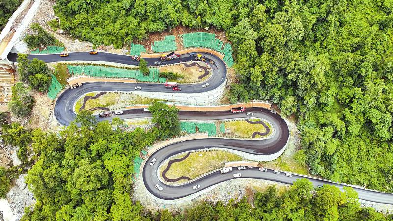 隨著道路基本修復(fù)完成,多個路段正進(jìn)行瀝青路面鋪筑。俯瞰視角中,黑色的旅游公路盤山而上,逶迤山間。據(jù)介紹,海螺溝景區(qū)道路不是簡單重建,而是恢復(fù)提升,全線按三級公路標(biāo)準(zhǔn)建設(shè),路基全部拓寬至7.5米,并鋪設(shè)瀝青混凝土路面;部分急彎陡坡段進(jìn)行了改善,提升了觀景臺、護(hù)欄的安全等級,行車舒適度大為提升。