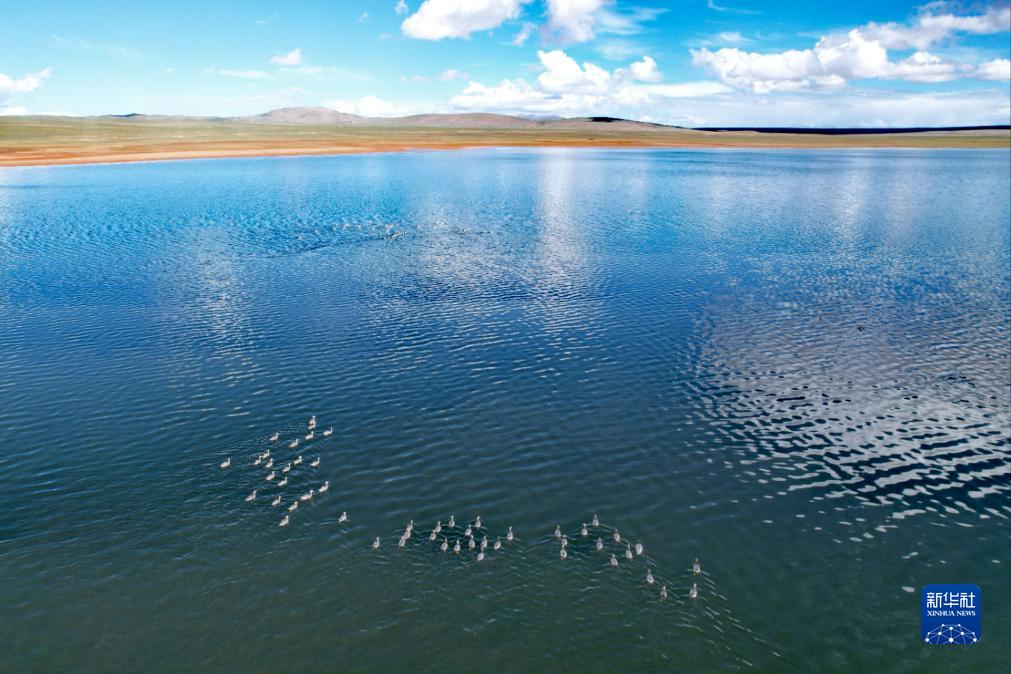 長江源區(qū)的水鳥群(7月26日攝,無人機照片)。 新華社記者 劉詩平 攝