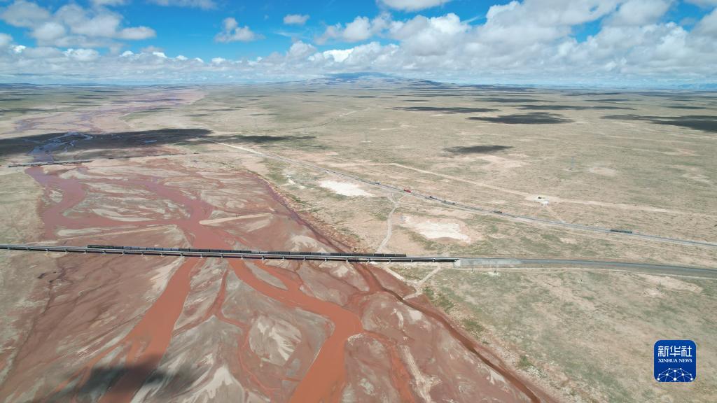 青藏鐵路列車通過楚瑪爾河(7月29日攝,無人機照片)。 新華社記者 劉詩平 攝