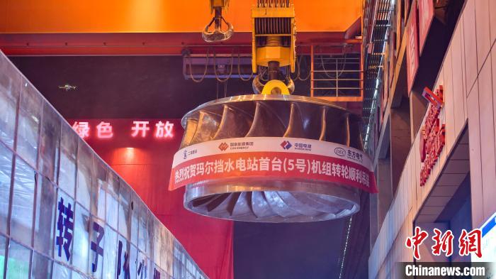 9月27日,瑪爾擋水電站首臺機(jī)組水輪機(jī)轉(zhuǎn)輪成功吊裝。(瑪爾擋水電站供圖)
