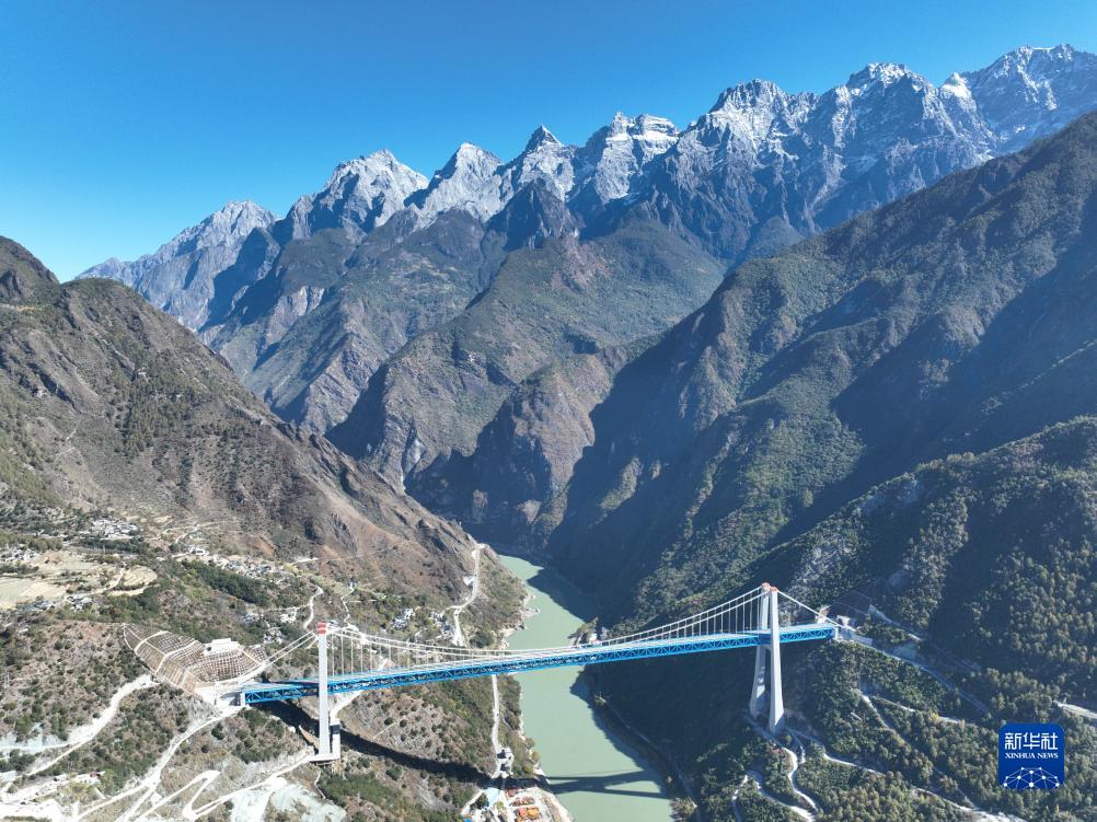11月26日,列車駛過(guò)虎跳峽金沙江鐵路大橋(無(wú)人機(jī)照片)。新華社記者 胡超 攝